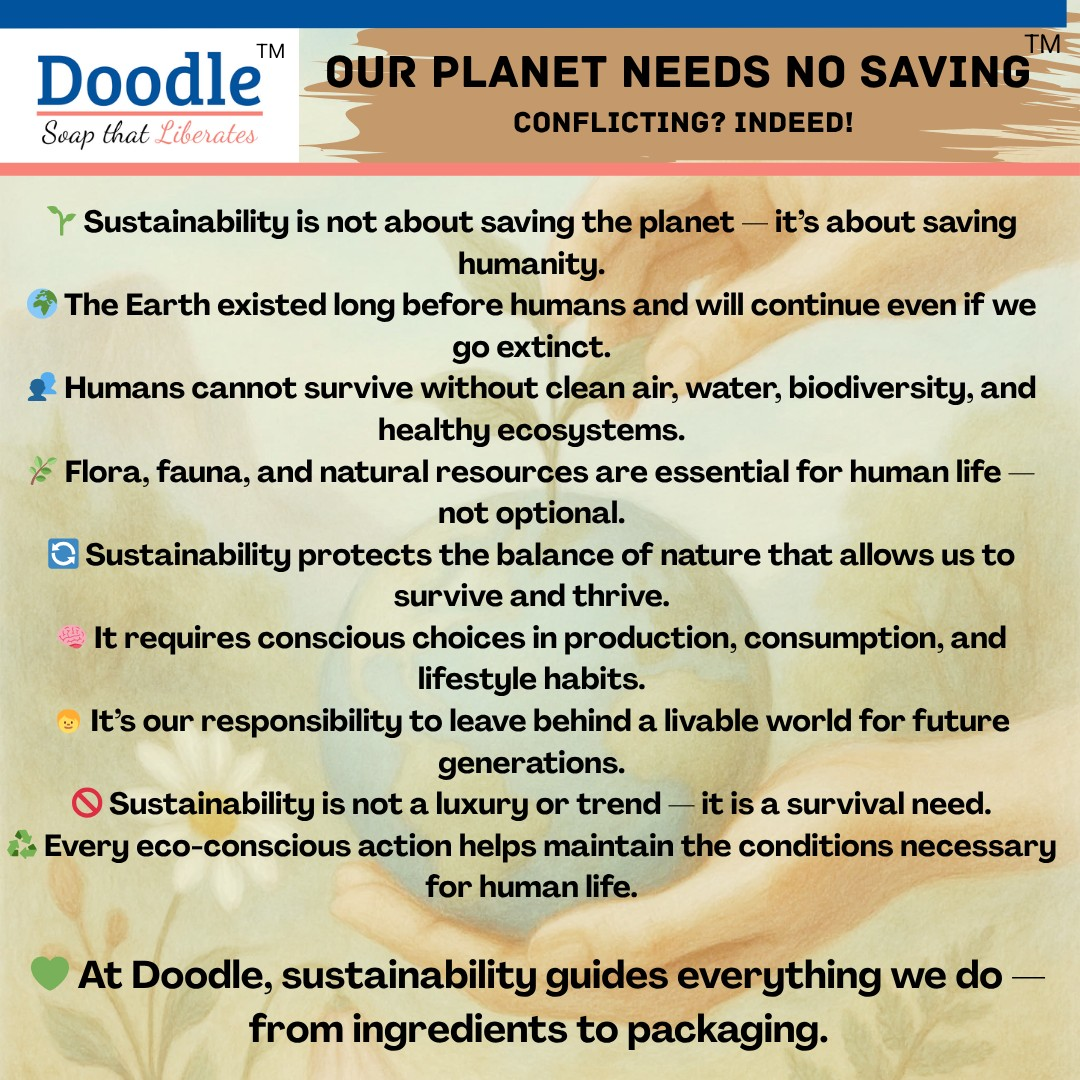 At GBVS Soapery, we believe that our planet needs no saving. The concept of saving the planet is not the right way to approach sustainability. The Earth existed long before humans came into existence and it will continue to exist even after the entire human species go extinct. Humans cannot survive without clean air, water, bio-diversity, healthy ecosystems, flora and fauna, and all the natural resources that are essential for us. And this isn't optional.