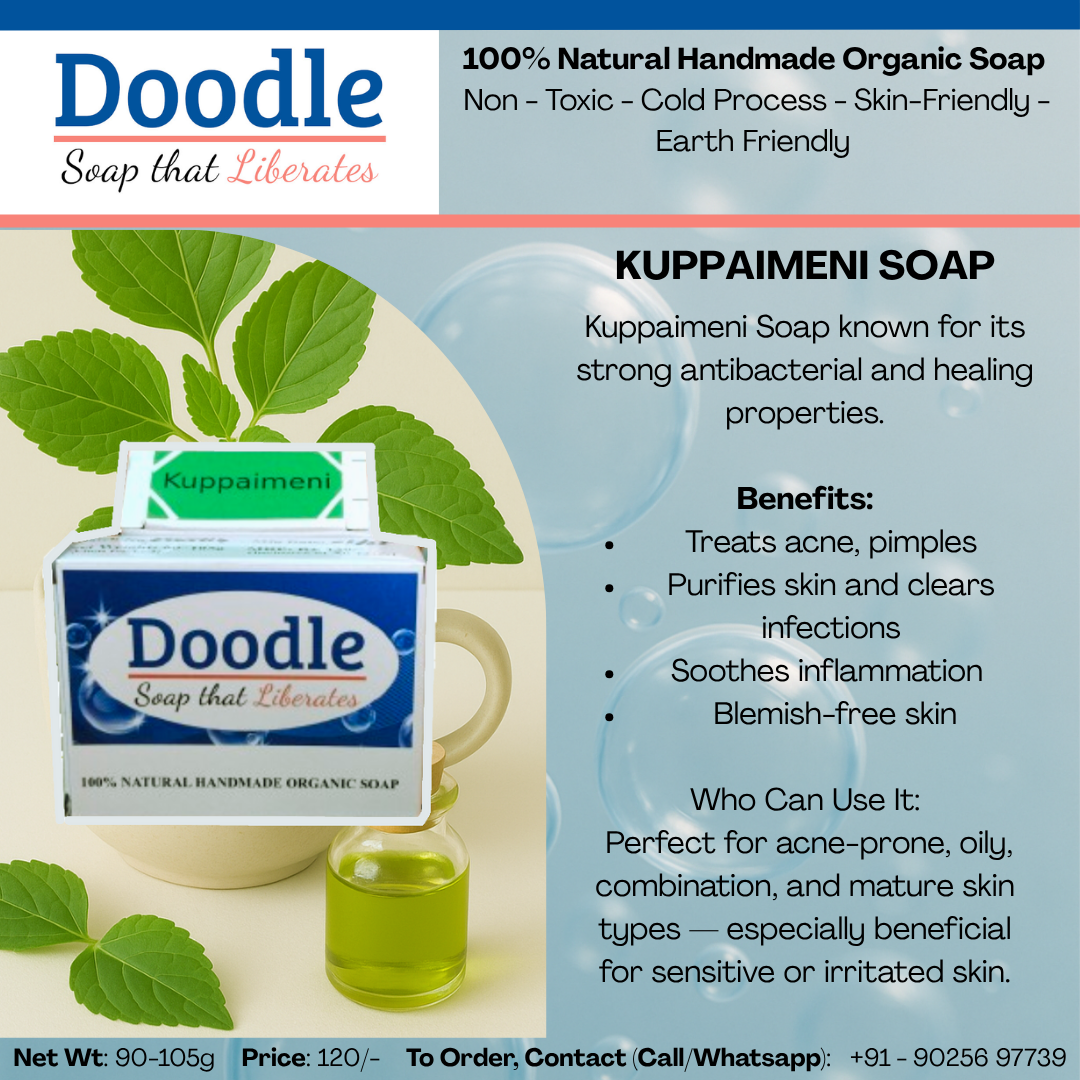 Doodle’s Kuppaimeni Organic Soap is a handcrafted, all-natural soap infused with the goodness of Acalypha Indica. This soap combines the anti-inflammatory, antibacterial, and skin-soothing properties of Kuppaimeni with a blend of other organic ingredients like coconut oil, pungam oil, and castor oil. Free from harsh chemicals, synthetic fragrances, and artificial colors, it offers a pure and gentle cleansing experience.