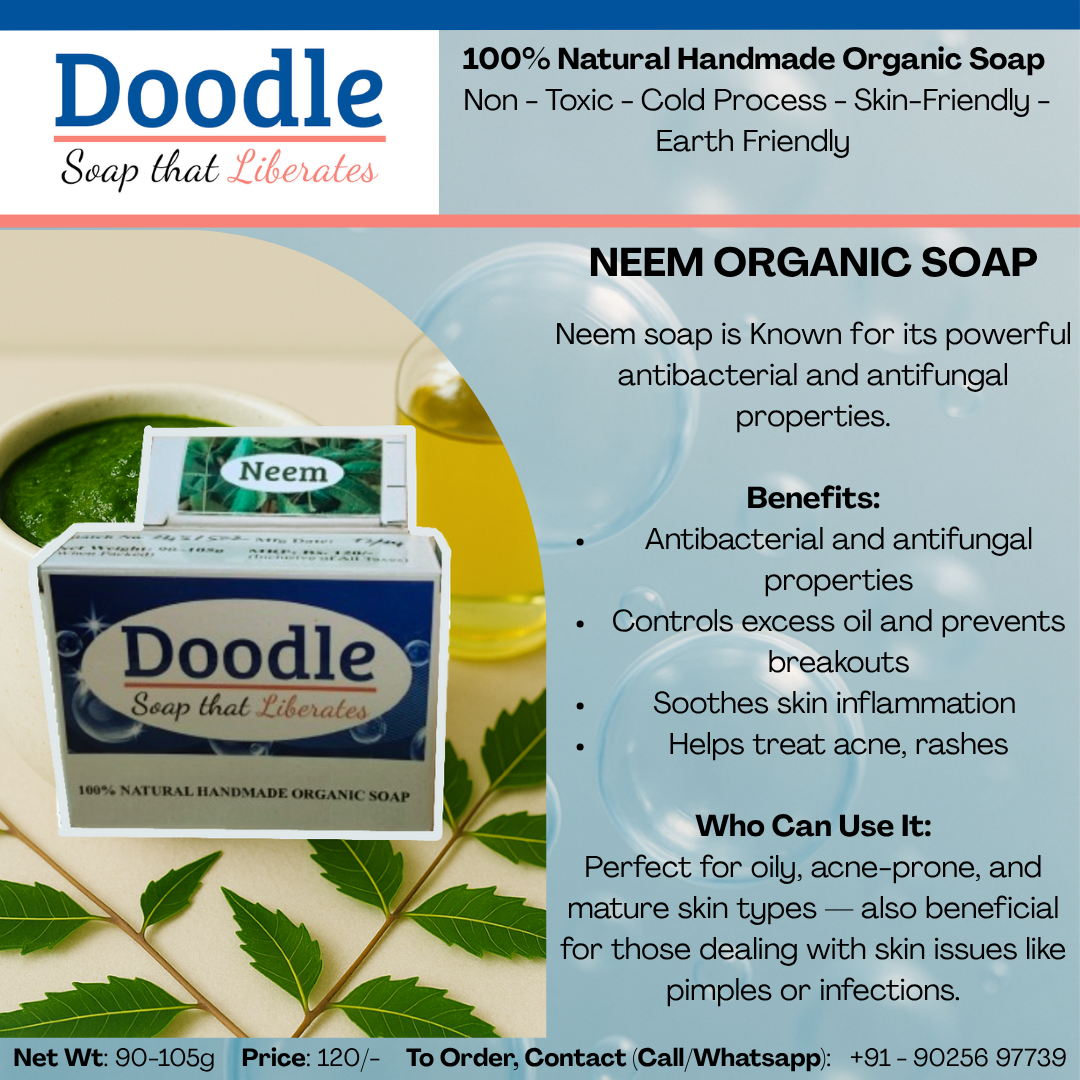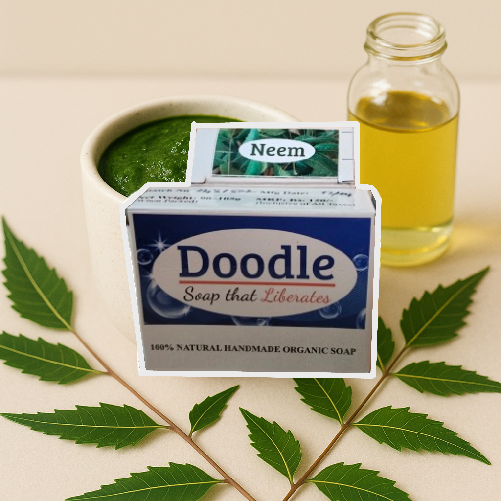 Doodle’s Neem organic soap is a natural soap made from the extract of the neem tree, scientifically known as Azadirachta indica. Renowned for its medicinal properties, neem has been used for centuries in traditional Indian medicine, Ayurveda. This organic soap is crafted without harmful chemicals, making it an eco-friendly and skin-friendly choice for your daily cleansing routine.