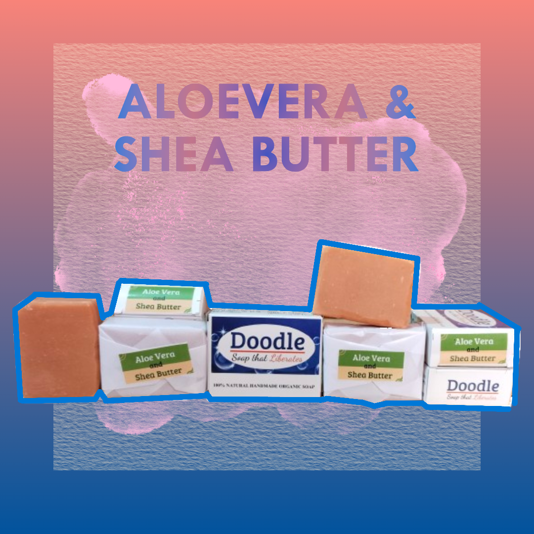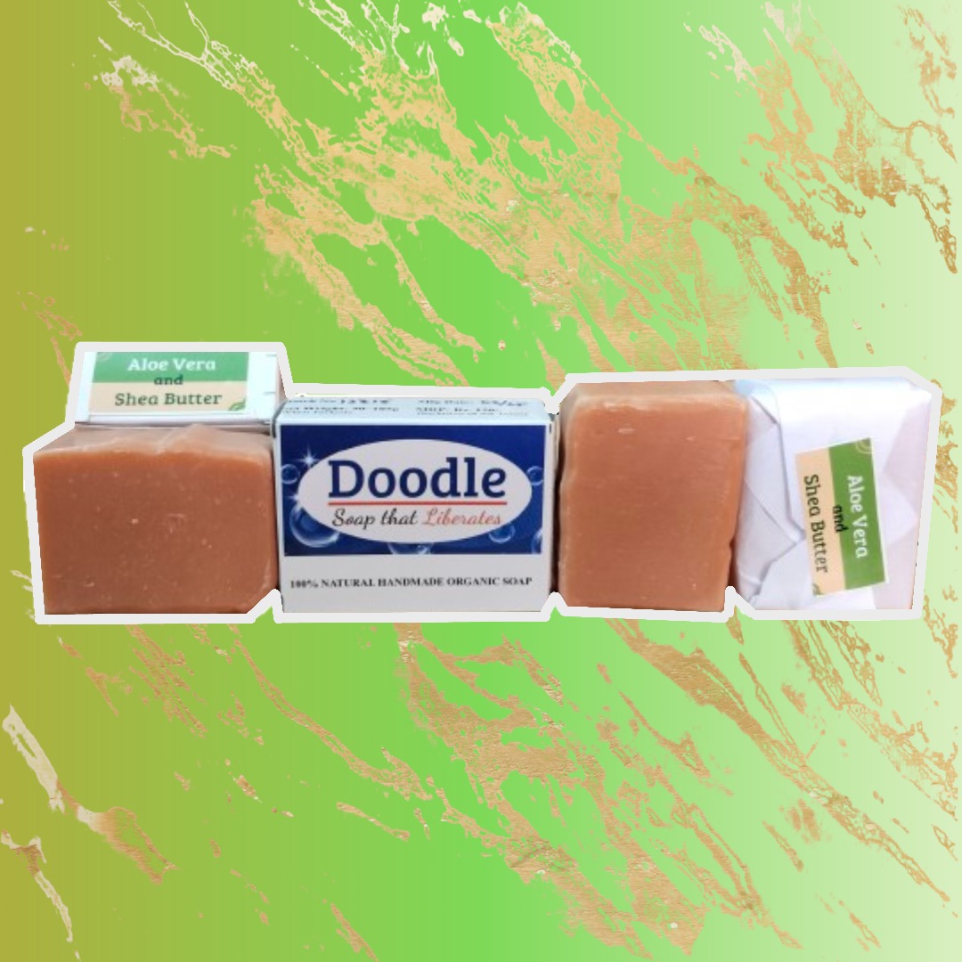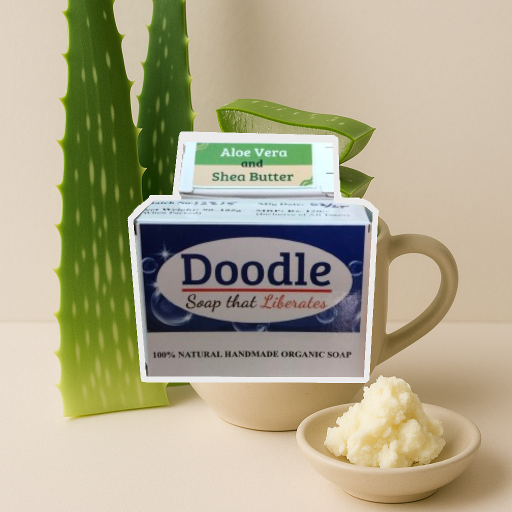 Doodle’s Aloe Vera & Shea Butter Organic Soap is a natural, chemical-free skincare product made from two of nature’s most nourishing ingredients: aloe vera gel and shea butter, blended into a soap base using organic oils and gentle cleansers. It’s designed to cleanse, hydrate, and soothe the skin while being safe and effective for all skin types.