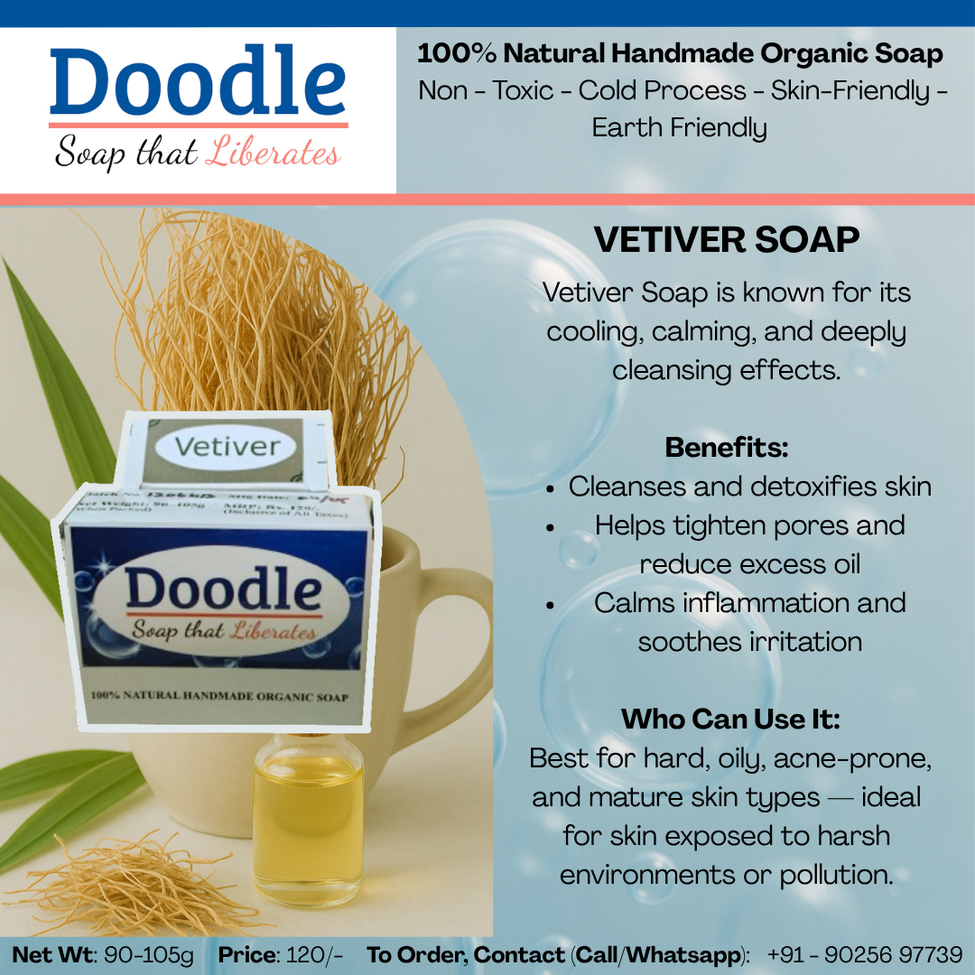 Doodle’s Vetiver organic soap is crafted with vetiver essential oil, derived from the roots of the vetiver grass, native to India. This soap combines vetiver’s rich, woody aroma with other natural, skin-loving ingredients to create a bar that offers more than just cleansing. It’s a full sensory experience, helping you feel refreshed, calm, and connected to nature.